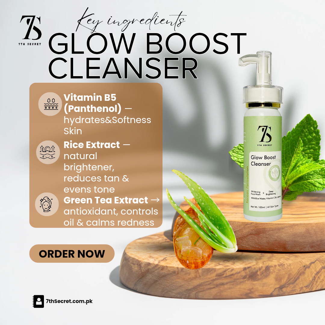 Glow Boost Cleanser gently removes impurities, excess oil, and dull surface cells, revealing clear, fair, and refreshed skin. Enriched with brightening and anti-tan ingredients to restore glow.